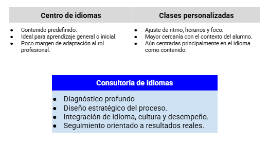 Un curso de idiomas suele partir del contenido. La consultoría de idiomas, en cambio, parte del problema.